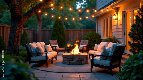 A backyard patio with comfortable outdoor furniture, string lights, and a cozy fire pit, perfect for relaxing evenings.