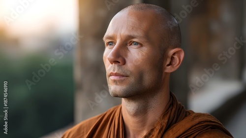 A bald Buddhist monk in a saffron robe gazes thoughtfully to the side in golden hour light