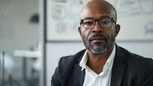 man, bald, professional, business, meeting, interior, suit, beard, white, goggles, serious, modern, expression, office, focused, room, attire, shirt, whiteboard, presentation, conference, work, board, background, environment, desk, attention, chair, design