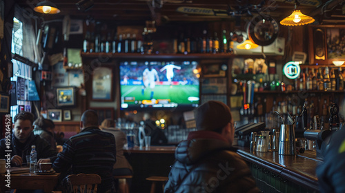 a bar with a TV on the wall and people watching the game.