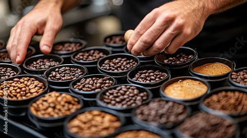 A barista grinding coffee beans with cappuccino cups ready for serving