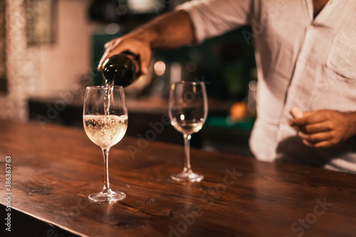A barman pouring white wine into a glass. Wooden table in a dark bar