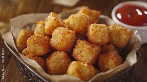A basket of crispy tater tots with a golden-brown exterior, served with ketchup and mustard for dipping