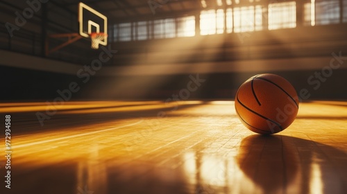 A basketball rests on a wooden court, illuminated by sunlight streaming through windows.