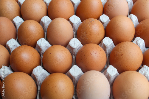 A batch of brown and speckled chicken eggs in a cardboard egg tray from close up