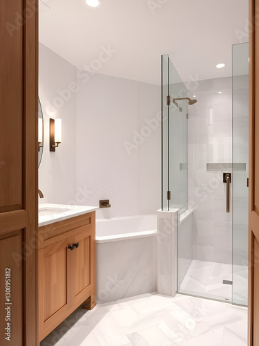 "A bathroom showcasing a natural wood cabinet with a white marble countertop, complemented by white herringbone tiles around the tub and a walk-in shower featuring large tiles."