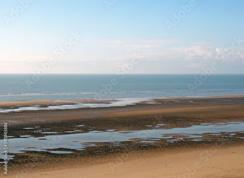 beach, sea, low tide, water, sky, blue, cloud, pool, horizon, yellow, line, calm, ocean, coast, distance, edge, shore, western, britain, england, atlantic, summer, resort, vacation, holiday, ripple, background, travel, tour tourism
