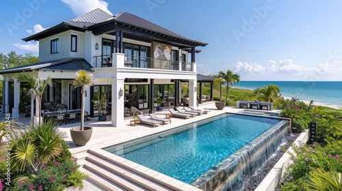A beach house with an infinity pool, white walls and a black roof on the main floor and a second story balcony overlooking the ocean in paradise
