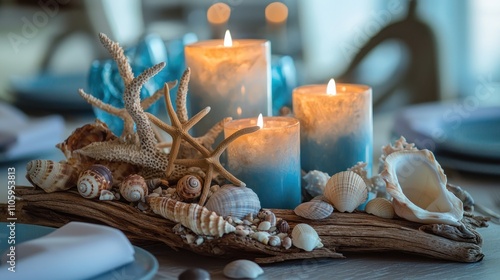 A beach-inspired table centerpiece made driftwood, seashells, and candles in ocean blue hues.