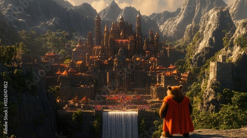 bear, cape, cliff, city, mountain, waterfall, landscape, nature, fantasy, magical, majestic, fairy tale, kingdom, castle, ancient, mediaeval, architecture, sky, cloud, sunset, gold, green, lush, flowing, powerful, serene, wonder, awe, adventure, dream, imagination, story, art, illustration, digital artwork, three-dimensional, render, concept, design, artwork, graphic, photo