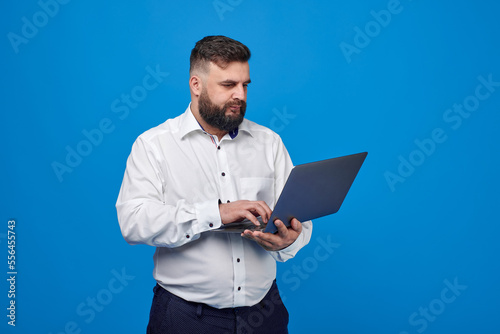 A bearded Caucasian man in a white shirt on a blue background holds a laptop. A solid man with a laptop.