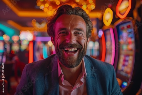 A bearded man radiates warmth and confidence as he smiles for the camera, his casual clothing adding to the welcoming atmosphere of the indoor setting