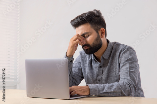 bearded, man, young, adult, indian, sitting, working, laptop, stress, anxious, emotion, modern, lifestyle, technology, office, portrait, urban, india, youth culture, grey, shirt, desk, independent, satisfied, productive, well-groomed, work, alone, expressive, solitude, half face, white background, room, real people, asian, one person, horizontal, half-length, indoor