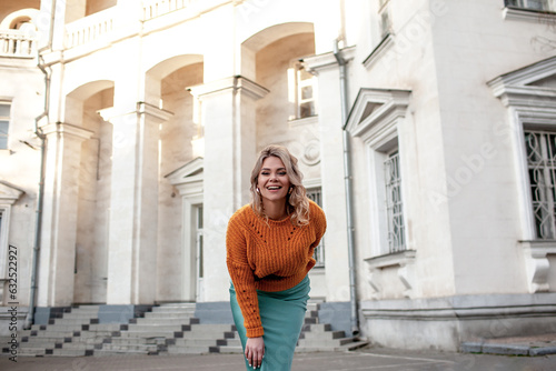 A beautiful girl walks through the streets of the cityю The woman is wearing fashion clothes, green skirt and yellow sweater