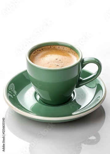 A Beautiful 4K Image of a Sleek Green Ceramic Coffee Cup with Light Foam, Elegantly Placed on a Matching Saucer Against a Pure White Background