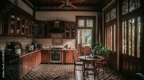 kitchen, wood, cabinet, countertop, appliance, oven, stove, sink, ceiling, fan, light, window, door, table, chair, plant, tile, floor, pattern, design, interior, house, home, dining, room, traditional, classic, style, elegant, dark, rustic, vintage, old, detail, decor, view, open, natural, shadow, space, clean, brown, glasses, display, storage, cupboard
