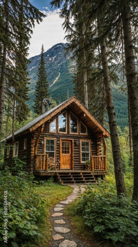 A beautiful and cozy wooden cabin in Alaska, nestled in the middle of a forest with mountains view