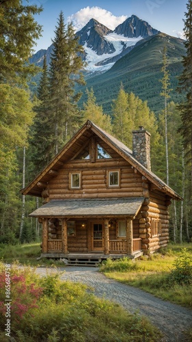 A beautiful and cozy wooden cabin in Alaska, nestled in the middle of a forest with mountains view