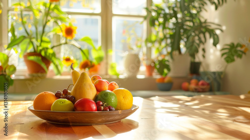 A beautiful arrangement of assorted fruits displayed in a bowl, illuminated by natural light with a serene background.