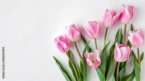 A beautiful arrangement of pink tulips on a white background, showcasing their vibrant colors and delicate petals.
