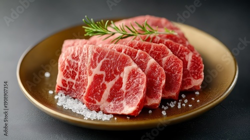 A beautiful arrangement of thin, raw beef slices with exquisite marbling, seasoned with sea salt and fresh rosemary, rests on a golden plate.