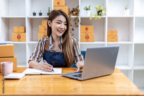 A beautiful Asian business owner opens an online store, she is checking orders from customers via laptop, sending goods through a courier company, concept of a woman opening an online business.