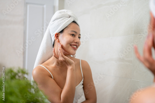 A beautiful Asian woman is touching her face and looking into the mirror in the bathroom.