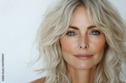 mature woman, white hair, skincare, elegance, natural beauty, woman, hair, beauty, blond, blond, face, fashion, model, smile, eye, person, 1, make-up, glamour, lip, coiffure, people, long, closeup, skin, make-up, looking, smiling, sensuality, curly