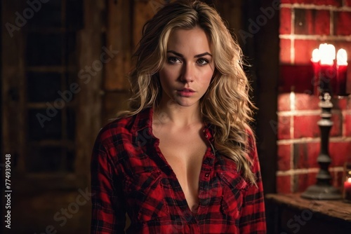 A beautiful blonde girl in a red plaid flannel shirt with cleavage in an old house at night by candlelight. Generative AI