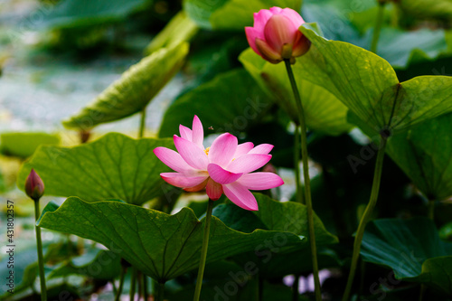 A beautiful blooming lotus flower grows on the lake. Pink lotuses in a pond in nature.