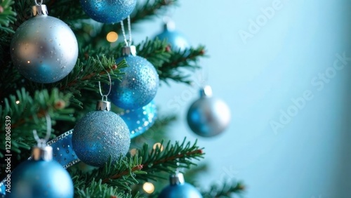 A beautiful blue and silver Christmas tree adorned with many shiny ornaments. The tree is the centerpiece of a festive room, and the blue and silver decorations give it a bright