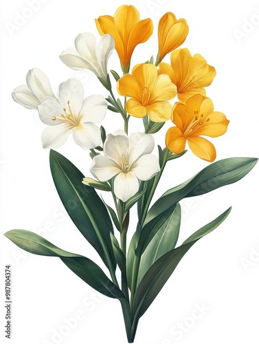 A beautiful bouquet of colorful freesias showcasing white and yellow blooms, perfect for floral arrangements and decorations, white background