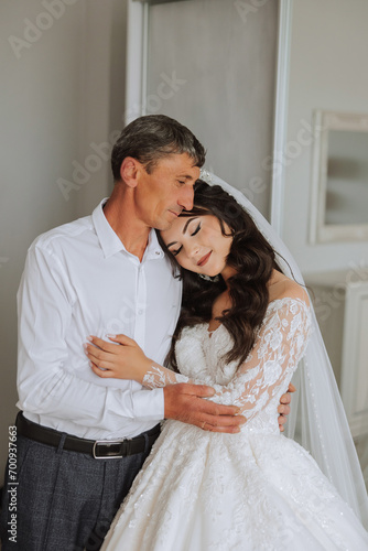 A beautiful bride with her father on her wedding day. The best moments of the wedding day. Daughter and father.