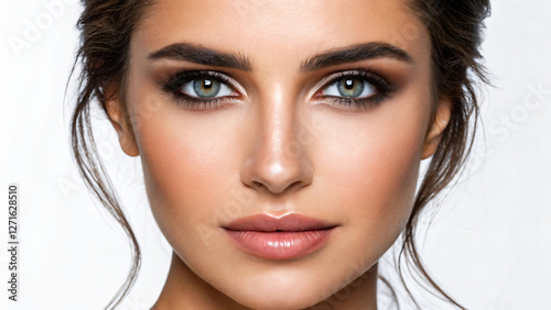 A beautiful brunette woman with red lips and long hair showcases her elegant makeup and flawless skin in a close-up studio portrait