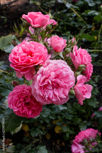 A beautiful bush of pink delicate roses, blossoming in the city park.