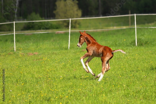 a beautiful chestnut foal with white high socks jumps against the background of a green spring meadow