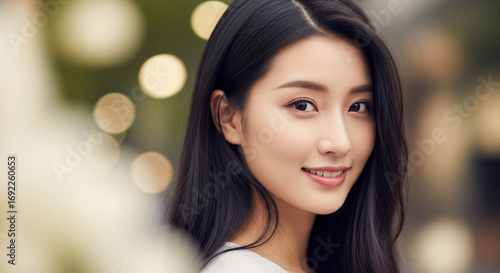 woman, chinese, beautiful, smile, gently, looking, viewer, soft, light, background, creating, peaceful, ambience, portrait, face, female, person, young, asian, ethnic, natural, outdoors, serene, calm, gentle, warm, glow, illumination, scene, setting, atmosphere, mood, expression, feature, eye, hair, lip, chin, cheek, skin