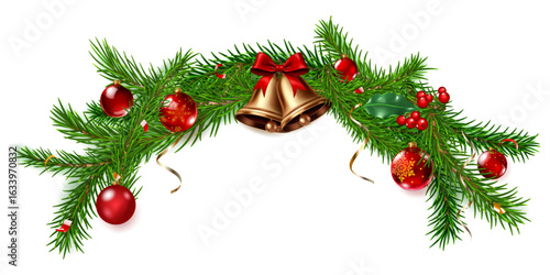 A beautiful Christmas garland composed of lush green pine branches, adorned with vibrant red ornaments and golden bells with elegant bow. With soft shadow, isolated on white background.