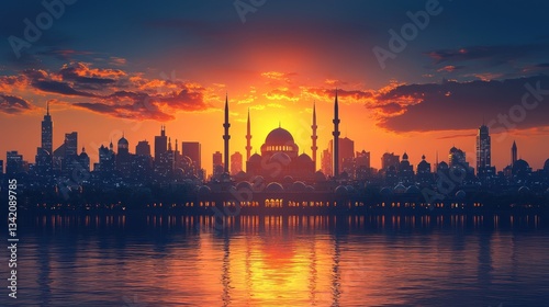 city, sunset, water, silhouette, building, architecture, skyline, evening, orange, sky, dusk, dawn, cloud, light, structure, horizon, nature, landscape, urban, city landscape, minaret, dome, tower, mosque, temple, travel, scenic, exterior, view, peaceful, tranquil, vibrant, pattern, design, detail, scene, twilight, calm, beautiful, warmth, perspective, aesthetic, culture, coast