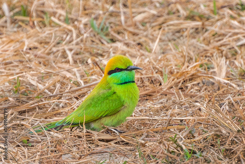 A beautiful close-up view of a Green bee-eater or little green bee-eater (Merops orientalis), sitting on ground in a blurred background. West Bengal, India