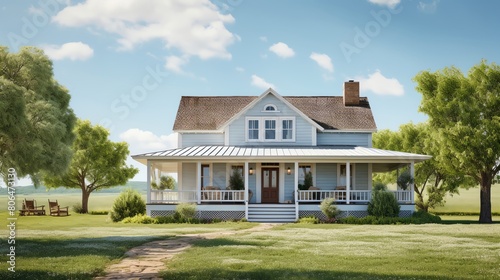 A beautiful country home sits on a lush green field. The home has a large porch and a swing. The sky is blue, and the sun is shining.
