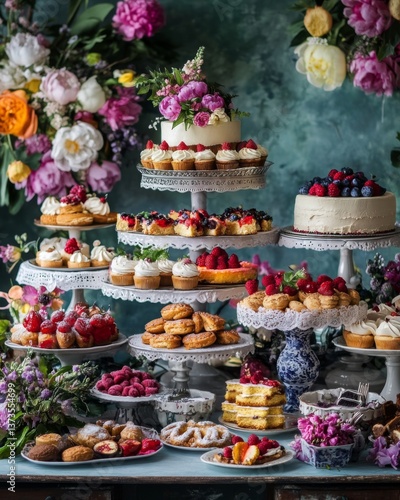 cake, pastry, dessert, flower, food, sweet, party, celebration, frosting, treat, platter, elegant, festive, stylish, colourful, bakery, cooking, photo, event, celebrate, colours, delicious, sweet, display, table, epicure, catering, fruit, cream, happy, decadent, cookery, receipe, indulgent, creative, inspiration, tasty, gathering