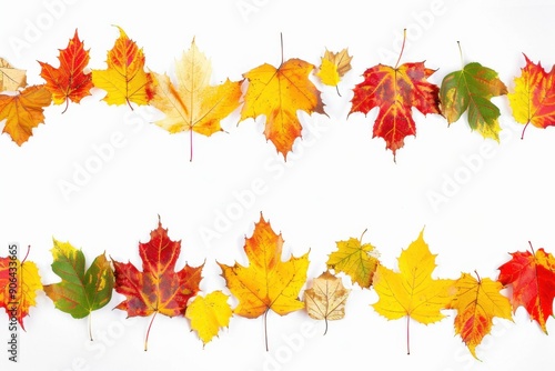 A beautiful display of colorful autumn leaves arranged in two rows on a white background.