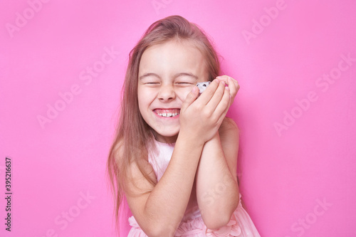 hamster, girl, hand, cute, happiness, care, hold, mammal, small, childhood, friends, play, caucasian, funny, pretty, domestic, rodent, copy, space, copy space, place, text, clean, frame, template, banner, pink, background, cut-out, isolated, isolate, animal, children, pet, people, love, children, smile, amiable, blond, white, grey, mouse