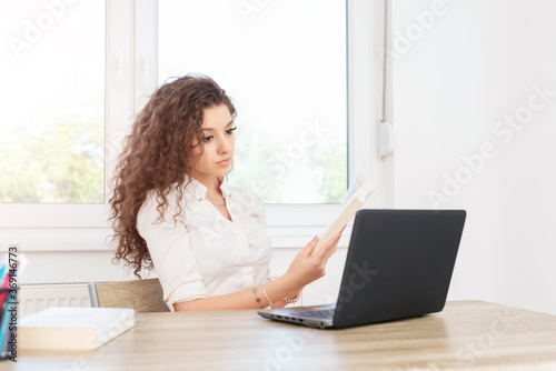 A beautiful girl is studying with a book and a laptop.