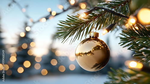 A beautiful golden ornament hangs from snow dusted pine branch, surrounded by soft, glowing lights that create warm, festive atmosphere. scene captures essence of joyful holiday season