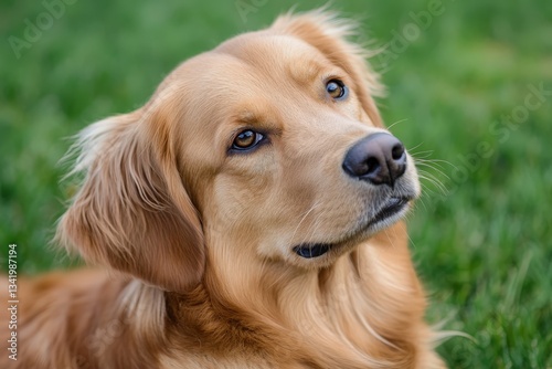 A beautiful golden retriever dog looking with attentive curiosity and interest