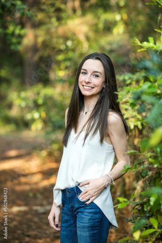 A beautiful happy teenage brunette girl outdoors in a wooded area in the spring