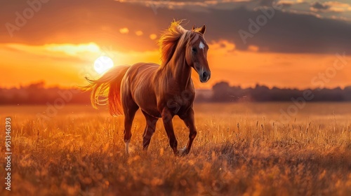 A beautiful horse silhouetted against the backdrop of a sun setting in the distance,