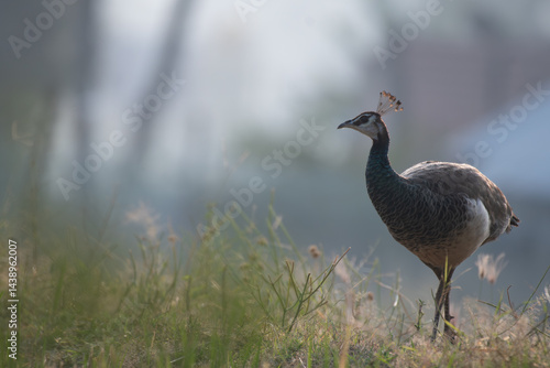 A beautiful Indian peahen stands gracefully in a field of vibrant grass. The background is soft focus with blurred.